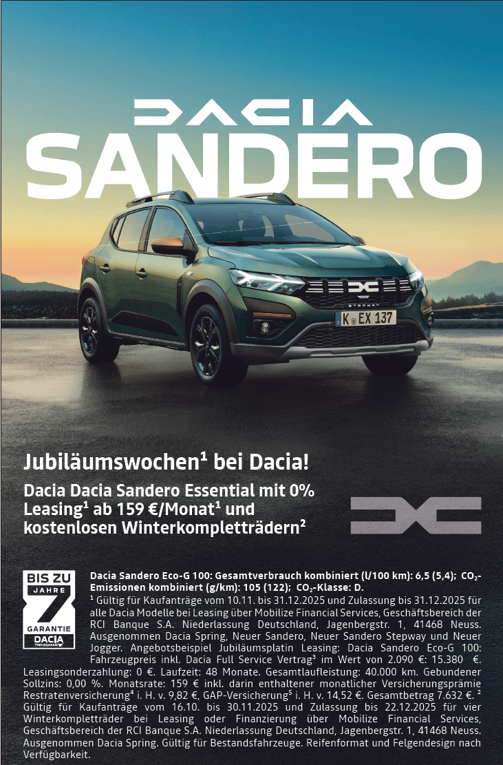 3 Bestehend aus Garantieverlängerung der Renault Deutschland AG6, Abdeckung aller Kosten der vorgeschriebenen Wartungs- und Verschleißarbeiten, HU sowie Mobilitätsgarantie für 36 Monate bzw. 30.000 km ab Erstzulassung gemäß Vertragsbedingungen. HU nach § 29 StVZO. Die HU wird nur durch zugelassene Prüfer und zu den von der zuständigen Prüforganisation festgelegten Preisen durchgeführt. 4 Über RCI Versicherungs-Service GmbH, Jagenbergstr. 1, 41468 Neuss. Versicherer: RCI Life Limited und RCI Insurance Limited, Level 3 Mercury Tower, The Exchange Financial & Business Centre, Elia Zammit Street, St. Julian’s, STJ 3155, Malta. 5 Über RCI Versicherungs-Service GmbH, Jagenbergstr. 1, 41468 Neuss. Versicherer: RCI Insurance Limited, Level 3 Mercury Tower, The Exchange Financial & Business Centre, Elia Zammit Street, St. Julian’s, STJ 3155, Malta. 4,5 Es gelten die allgemeinen Versicherungsbedingungen. 6 Garantiegeberin ist die Renault Deutschland AG. Die Inanspruchnahme der gesetzlichen Gewährleistungsansprüche ist unentgeltlich. Diese Ansprüche bestehen unabhängig von der Garantie und werden durch diese nicht eingeschränkt. 7 Dacia Treuegarantie der Renault Deutschland AG, nach Ablauf der Herstellergarantie bis maximal 7 Jahre oder 150.000 km. Mit Garantieanspruch gemäß Garantiebedingungen bei regelmäßiger Wartung nach Herstellervorgabe bei Ihrem Dacia Vertragspartner. Weitere Informationen unter: https://www.dacia. de/treuegarantie.html. Abb. zeigt Dacia Sandero Stepway mit Sonderausstattung.
