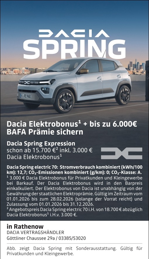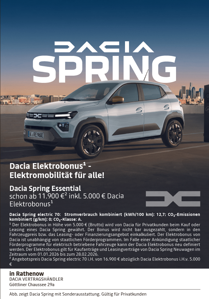 1 Leasing: Dacia Spring Essential electric 45: Fahrzeugpreis: 14.384,50 €. Leasingsonderzahlung: 1.180,75 €. Laufzeit: 48 Monate. Gesamtlaufleistung 40.000 km. Monatsrate: 129 €. Gesamtbetrag: 7.372,75 €. Ein Kilometer-Leasingangebot von Mobilize Financial Services, Geschäftsbereich der RCI Banque S.A. Niederlassung Deutschland, Jagenbergstr. 1, 41468 Neuss, zzgl. Überführungskosten. Güttig für Leasingverträge von Dacia Neuwagen vom 01.09.2025 bis zum 31.09.2025 und Zulassung vom 01.09.2025 bis 30.09.2025. Eine Werbung der Renault Deutschland AG, Peter-Huppertz-Str. 5, 51063 Köln.